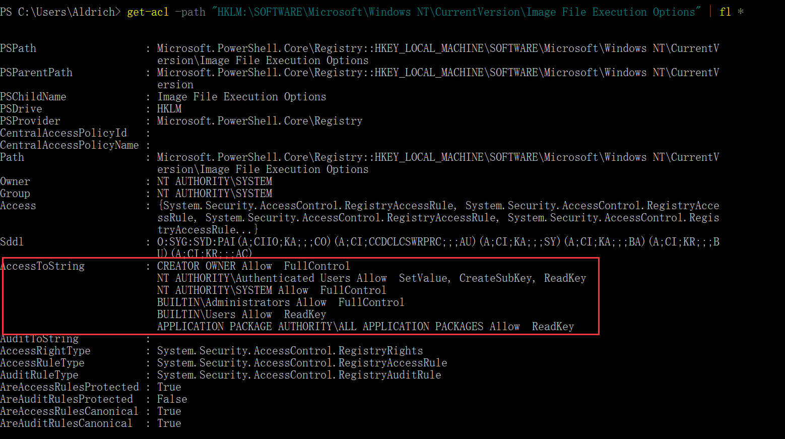 1 | get-acl -path "HKLM:\SOFTWARE\Microsoft\Windows NT\CurrentVersion\Image File Execution Options" | fl * |