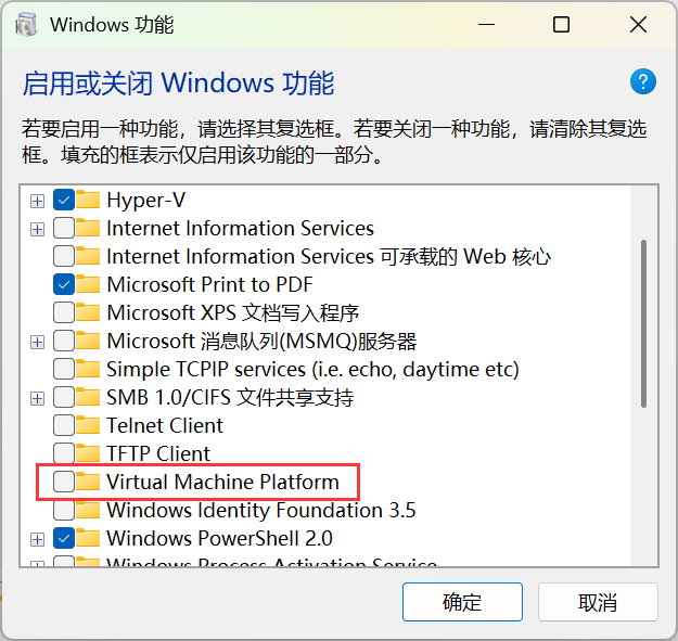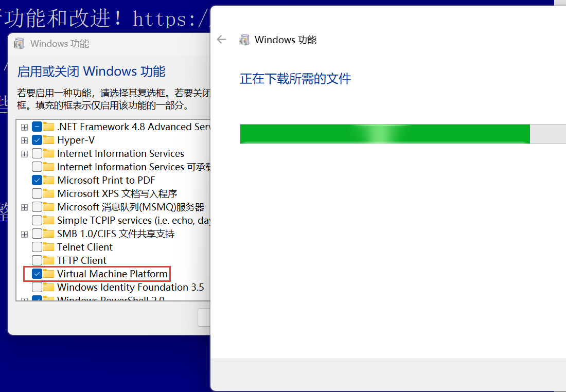 我在解决完 Hyper-V 之后又出现了 Virtual Machine Platform 的问题,这也是一个虚拟化平台,我并没有去深究它和前面的 Hyper-V 有什么区别,前面的没了只是 docker 会出问题 VMware 是不受影响的,而这个掉了的话都会影响。